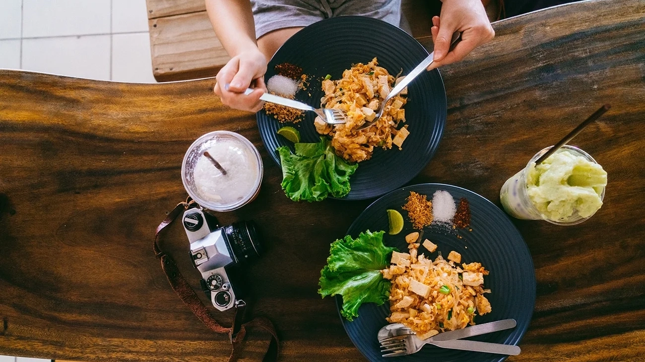 Traditionally, Thai food is eaten with a fork and spoon. Hold the fork in your left hand and use it to push food onto the spoon in your right. The fork doesn’t go in your mouth.