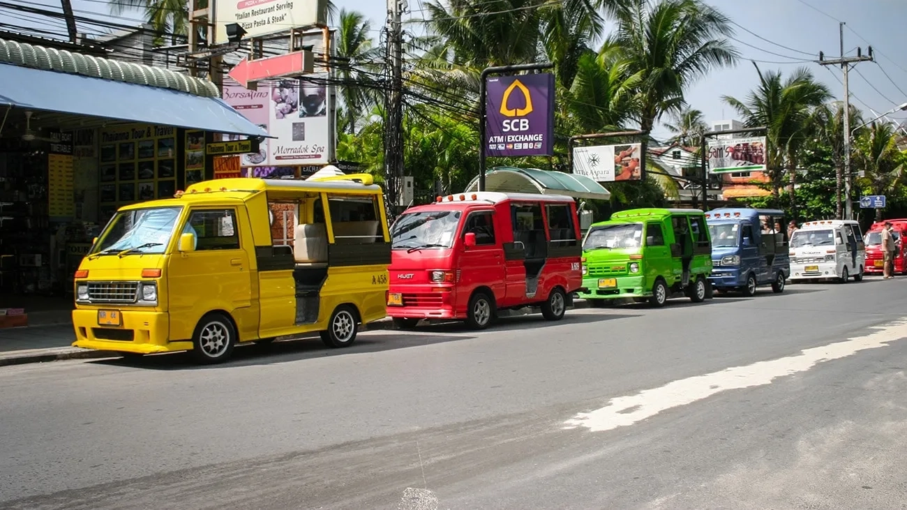 Songthaews are easily recognisable blue utes with a cover and a couple of benches on the back for people to sit on. They’re spartan and cheap but drive between Phuket Town and the beaches, not between the beaches. There are no official stops, just flag one down.
